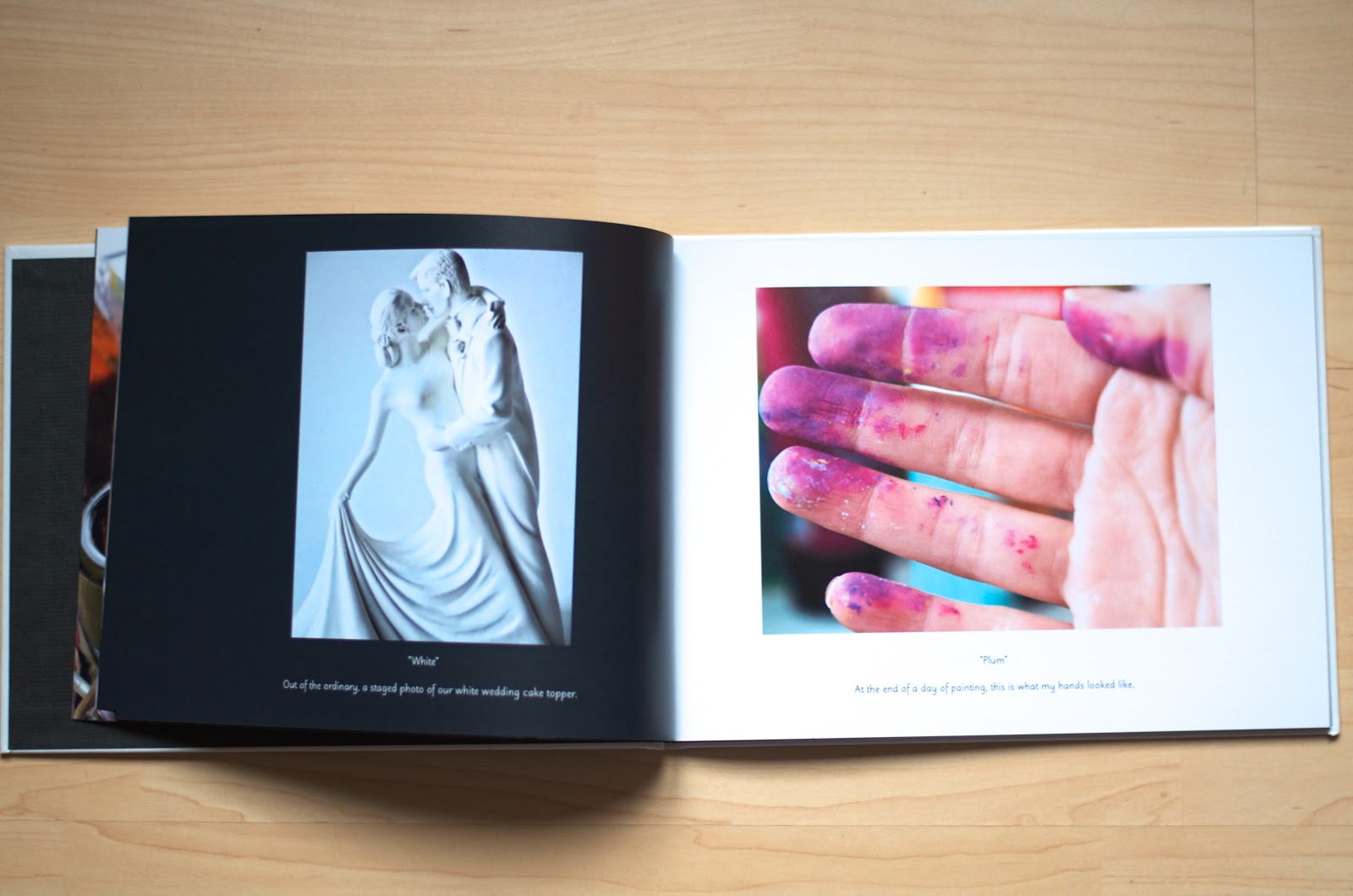 My book is a 8.5x11 custom cover book. I used the studio theme which kept it a simple black and white and I could change up the photo sizes. Mostly I left my photos big. At the bottom or on the side, depending on the layout, I wrote the color and a little bit about each photo. It ended up being 66 pages all together.