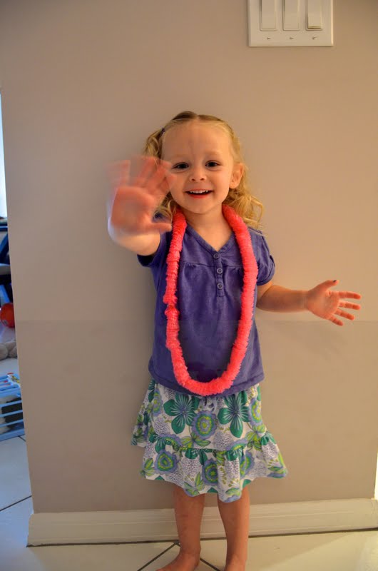 Her class had a Hawaiian themed week and had a party where they danced and got lei's. We taught her that Aloha was how to say hello in Hawaiian.