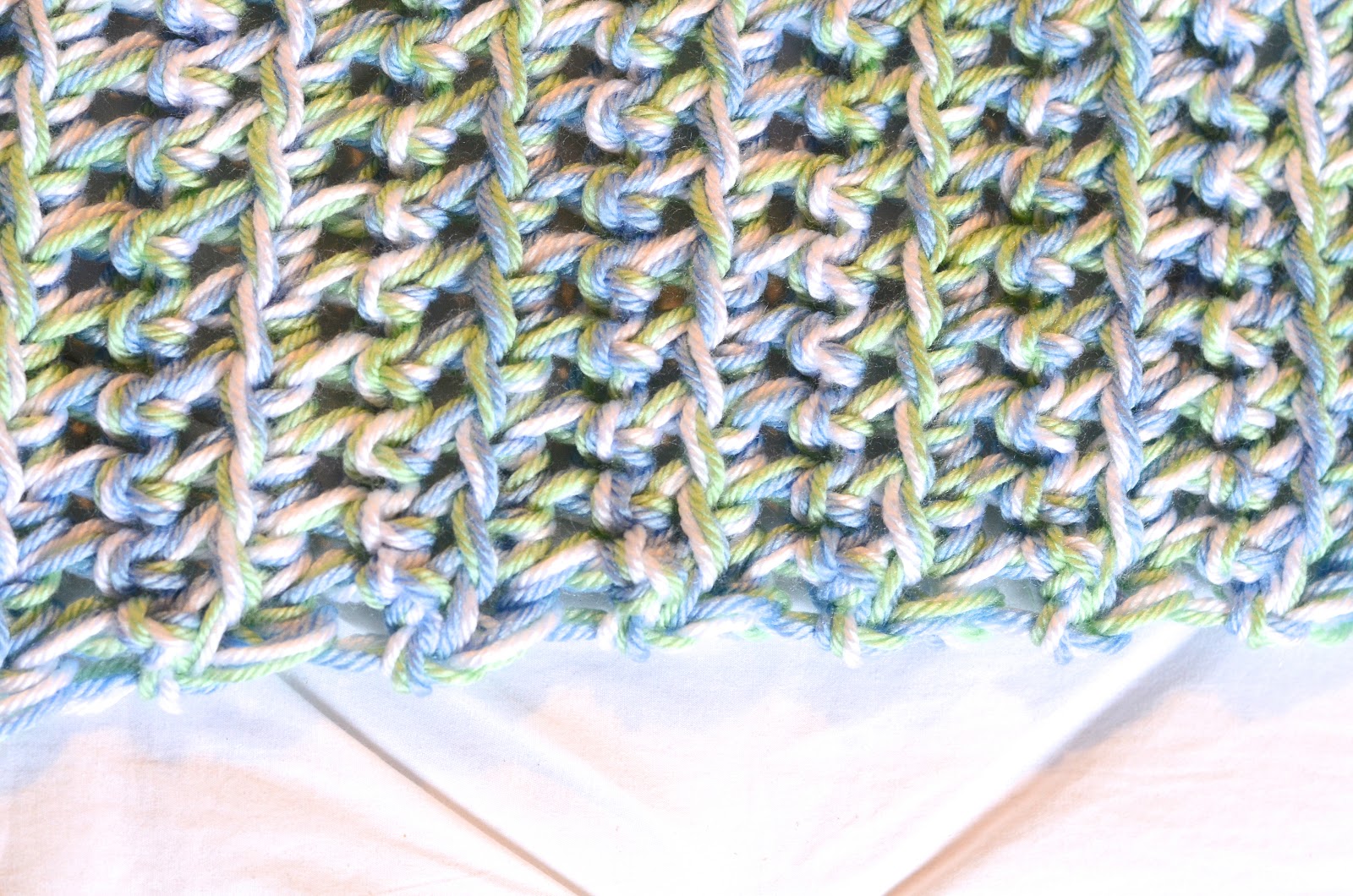 I did a simple single crochet using all three yarns at the same time using a large size P crochet needle. The effect was really pretty and created a really bulky warm blanket for our September baby.