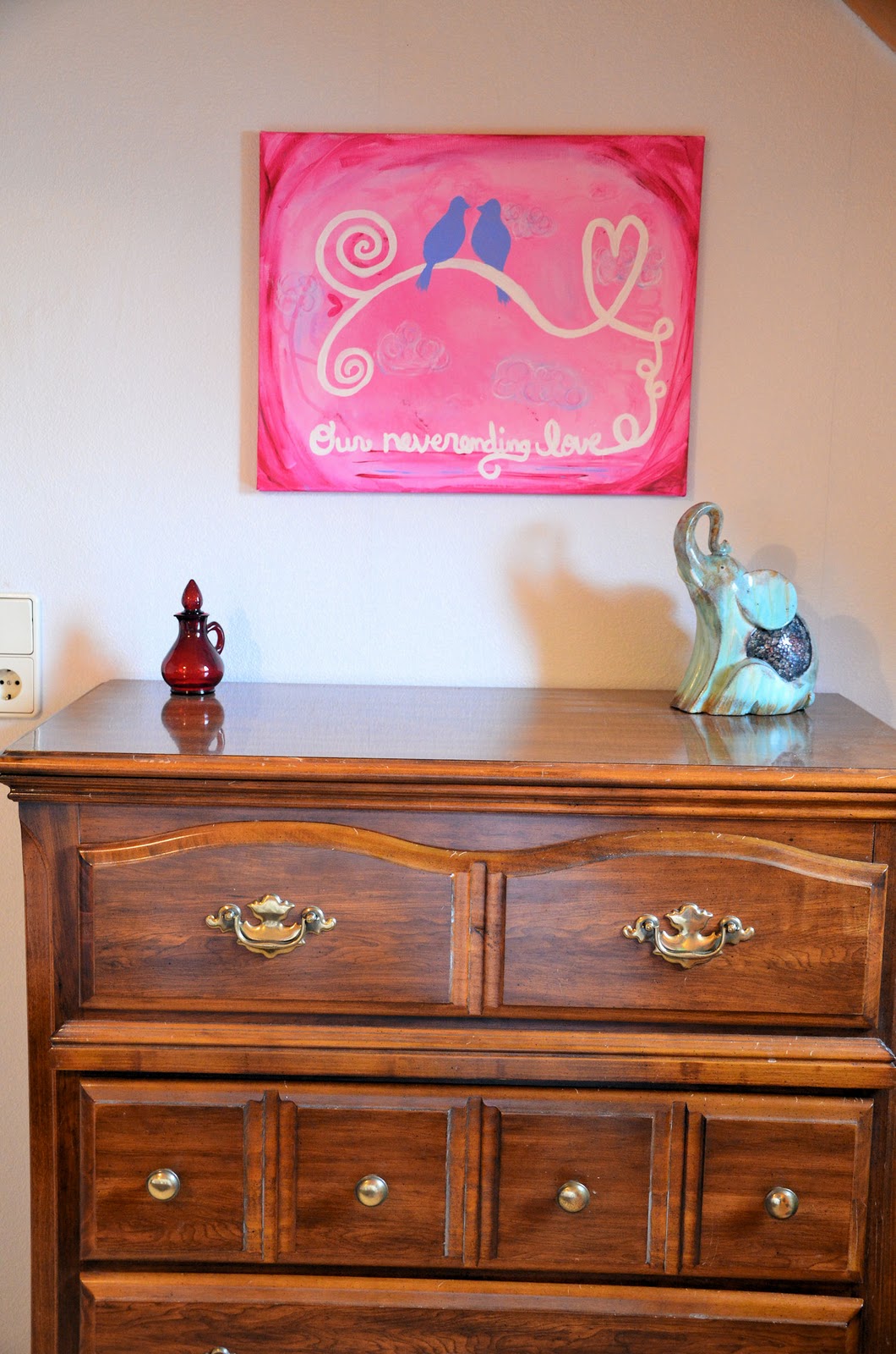 Chest of drawers with our bird painting, another one by me, and my Grandma's old Avon bubble bath bottle and my elephant.