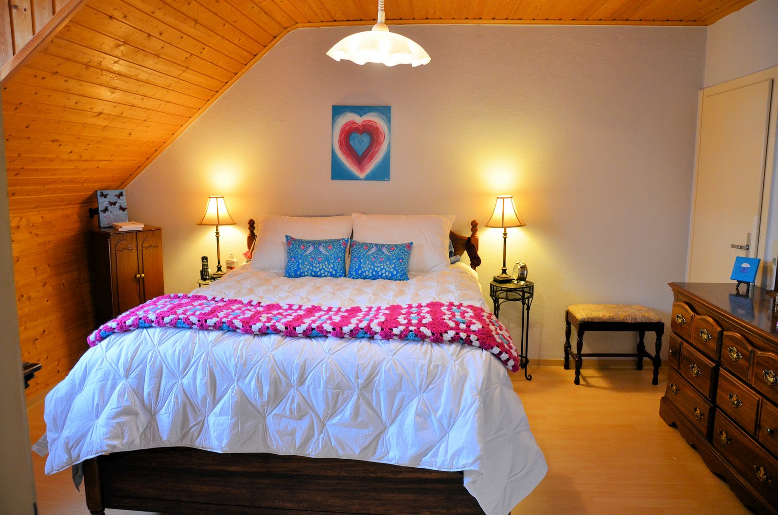 This past weekend, I FINALLY finished the granny square blanket for our bedroom. Yipee for me!! It's ginormous! It almost covers our entire queen size bed! I thought I would share some pictures of the blanket and also give you a tour of our new bedroom in our new house in Germany.